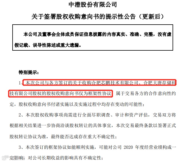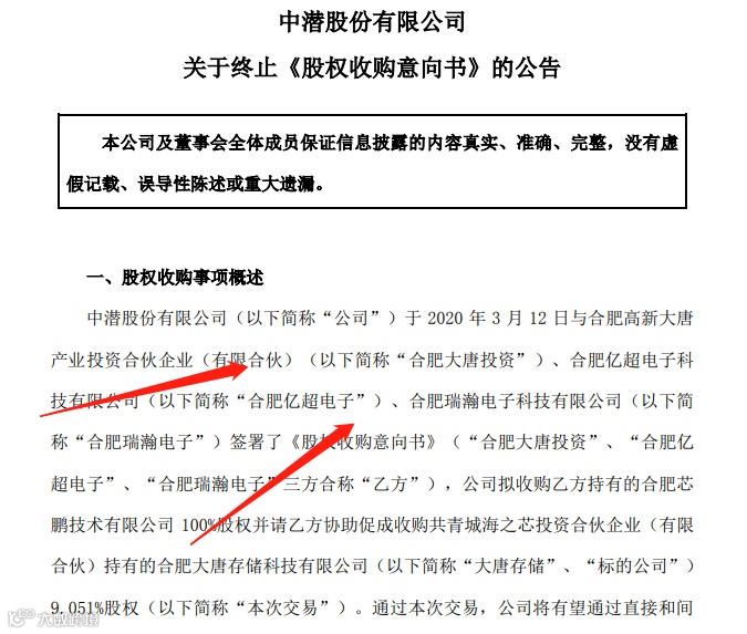 2020年3月13日,中潜股份发布《关于签署股权收购意向书的提示性公告》,披露公司与合肥大唐投资、合肥亿超电子、合肥瑞翰电子、共青城海之芯签署了股权收购意向书,拟通过现金购买合肥芯鹏技术有限公司100%股权、合肥大唐存储科技有限公司9.05%股权,通过上述交易,公司谋求持有大唐存储超过80%的控股权。