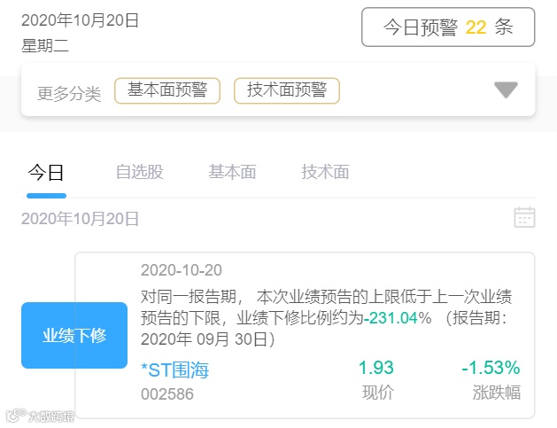 今天日共有22条基本面股票预警,大家注意规避风险,以上是股票预警详情(图片来源:股神派)。公众号后台回复【预警】两个字,查看预警详情。