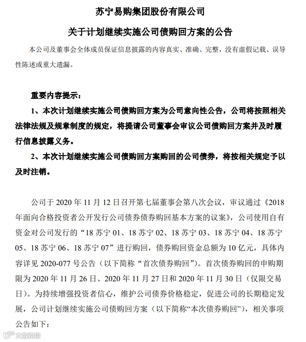 12月2日晚,苏宁易购发布回购进展公告,称“18苏宁01“等7只债券已完成购回,公司将于12月9日足额支付债券购回金额至深圳分公司指定的银行账户。