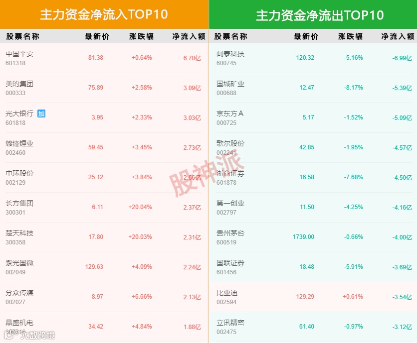 主力资金净流入前5的个股是中国平安,美的集团,光大集团,赣锋锂业,中环股份,净流入额分别为6.70亿、3.09亿、3.03亿、2.73亿、2.66亿。主力资金净流出前5的个股是闻泰科技,国城矿业,京东方A,歌尔股份,浙商证券,净流出额分别为6.99亿、5.39亿、5.09亿、4.57亿、4.50亿。