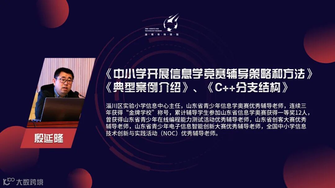 淄川区实验小学信息中心主任、山东省青少年信息学奥赛优秀辅导老师殷延隆作题为《中小学开展信息学竞赛辅导策略和方法》《典型案例介绍》和《C++分支结构》的讲座,结合自身经验从教学理念、学习编程的好处、学习过程、学校辅导课程、信息学奥赛的参与、信息学奥赛的介绍6个方面对程序设计社团经验和典型案例进行了分享,并对信息学竞赛C++分支结构知识进行了培训。