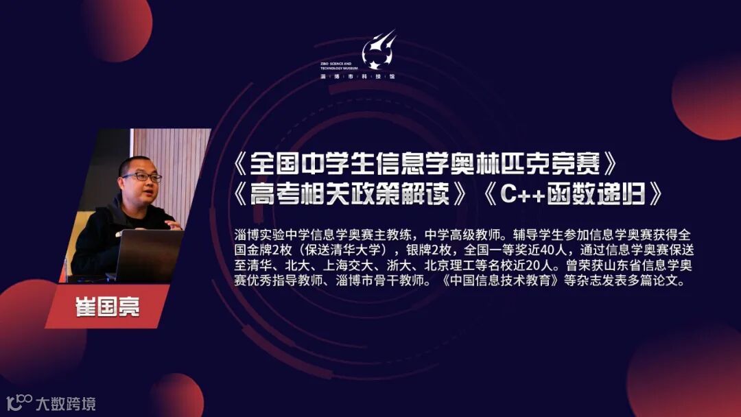 淄博实验中学信息学奥赛主教练、中学高级教师崔国亮作题为《全国中学生信息学奥林匹克竞赛》《高考相关政策解读》和《C++函数递归》的讲座。针对中高考,为大家带来新形势下信息学奥赛的相关政策解读,并结合自身教学经验对信息学竞赛C++函数和递归方面的知识进行了分享。