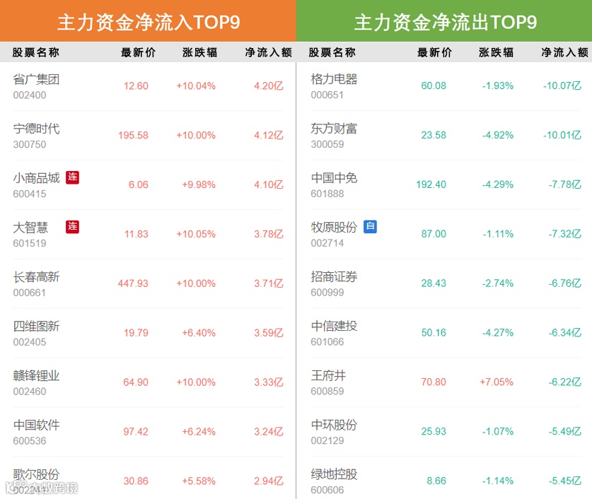 主力资金净流入前5的个股是省广集团,宁德时代,小商品城,大智慧,长春高新,净流入额分别为4.20亿、4.12亿、4.10亿、3.78亿、3.71亿。主力资金净流出前5的个股是格力电器,东方财富,中国中免,牧原股份,招商证券,净流出额分别为10.07亿、10.01亿、7.78亿、7.32亿、6.76亿。