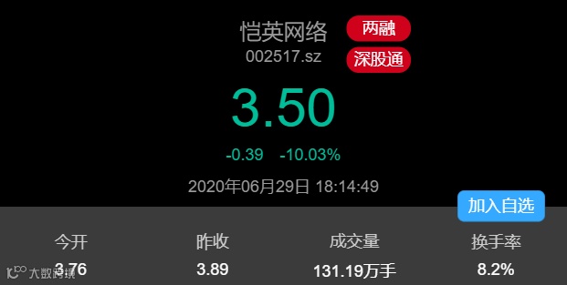 今日开盘,恺英网络大跌近7%,截至今日收盘,其股价报3.50元/股,总市值75.34亿元。