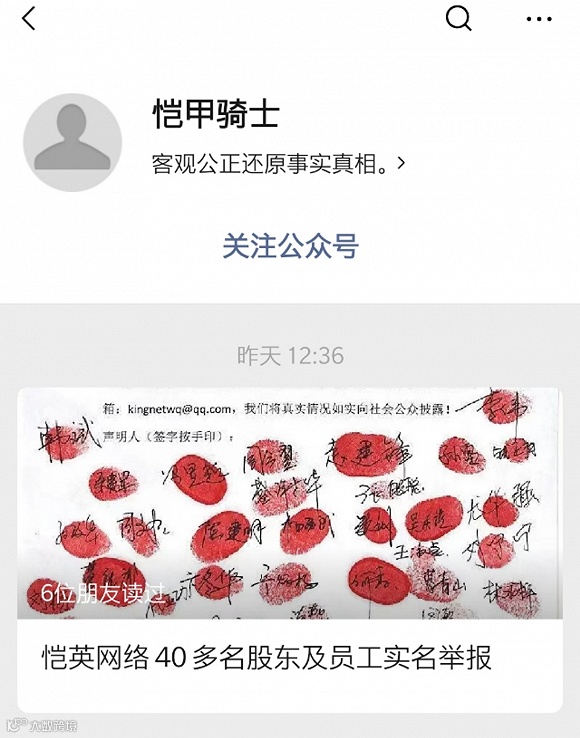 6月28日,一个以上海圣杯投资管理合伙企业为账号主体的微信公众号“恺甲骑士”发布了一则《恺英网络40多名股东及员工实名举报》文章,将恺英网络又带入大众眼中。