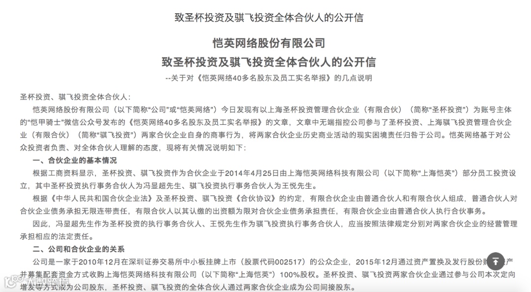 6月28日当晚发布了《致圣杯投资及骐飞投资全体合伙人的公开信》,恺英网络表示《举报》中无端指控公司参与了圣杯投资、骐飞投资两家合伙企业自身的商事行为,将两家合伙企业历史商业活动的现实困境责任归咎于公司。
