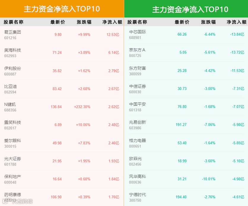 净流入额分别为12.53亿、6.14亿、2.79亿、2.67亿、2.62亿。主力资金净流出前5的个股是