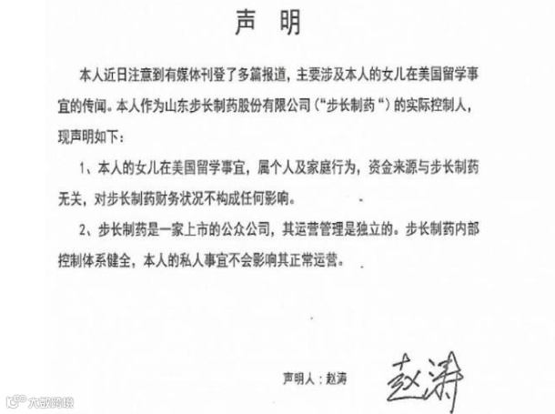 当事人,也是该公司的董事长赵涛随即发表声明表示,其女儿在美留学事宜属于个人及家庭行为,资金来源与步长制药无关,且对步长制药财务状况不构成任何影响。