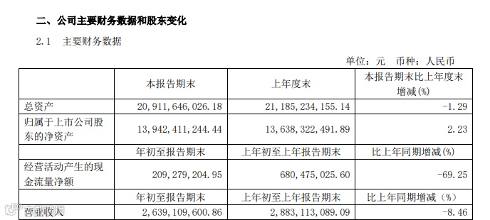 财报显示,公司一季度营业收入为26.39亿元,较上年同期下降8.46%;归属于上市公司股东的净利润3.04亿元,较上年同期增长7.07%。