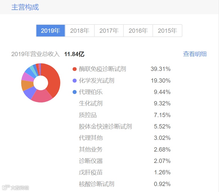 万泰生物主要是从事体外诊断试剂、仪器与疫苗的研发、生产及销售的企业。万泰生物2017年、2018年、2019年分别实现营业收入9.49亿、9.83亿元和11.84亿元。