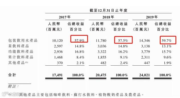 从细分品类来看,2017年、2018年以及2019年的营收中,农夫山泉饮用水收入占比都超过57%,近一年稍有提升至59.7%达143.5亿元,而茶饮料和功能饮料的占比则分别为13.1%和15.7%。