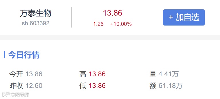 4月29日,万泰生物正式在上海证券交易所挂牌上市,发行价为8.75元/股。截至30日收盘,万泰生物报收13.86元/股,较发行价上涨54%,市值约为60.10亿元。