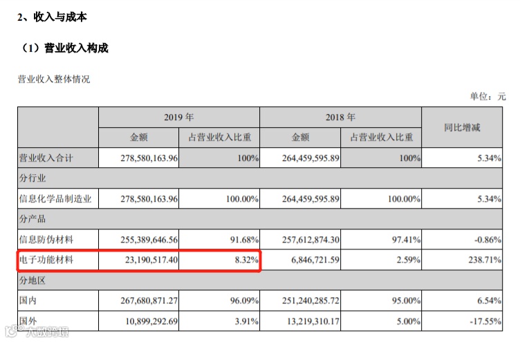 一是新产品未来销售规模不及预期的风险。虽然公司电子功能材料业务收入在2019年实现了238.71%的增速,但收入规模不大,仅为2319.05万元。