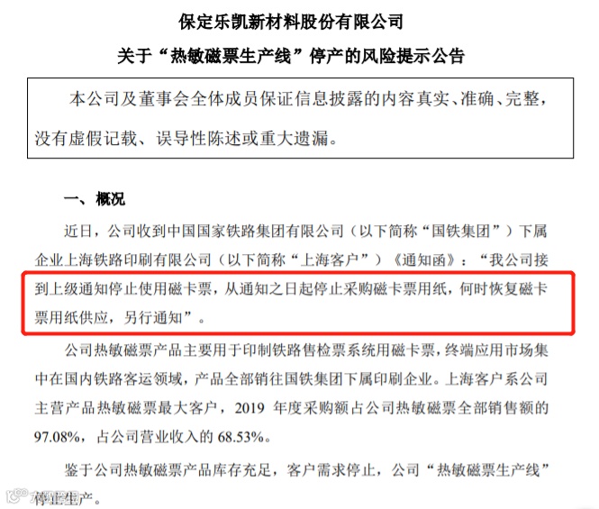 对此,乐凯新材表示,鉴于公司热敏磁票产品库存充足,客户需求停止,“热敏磁票生产线”停止生产。停产会对公司营业收入、现金流和经营性利润产生重大不利影响。