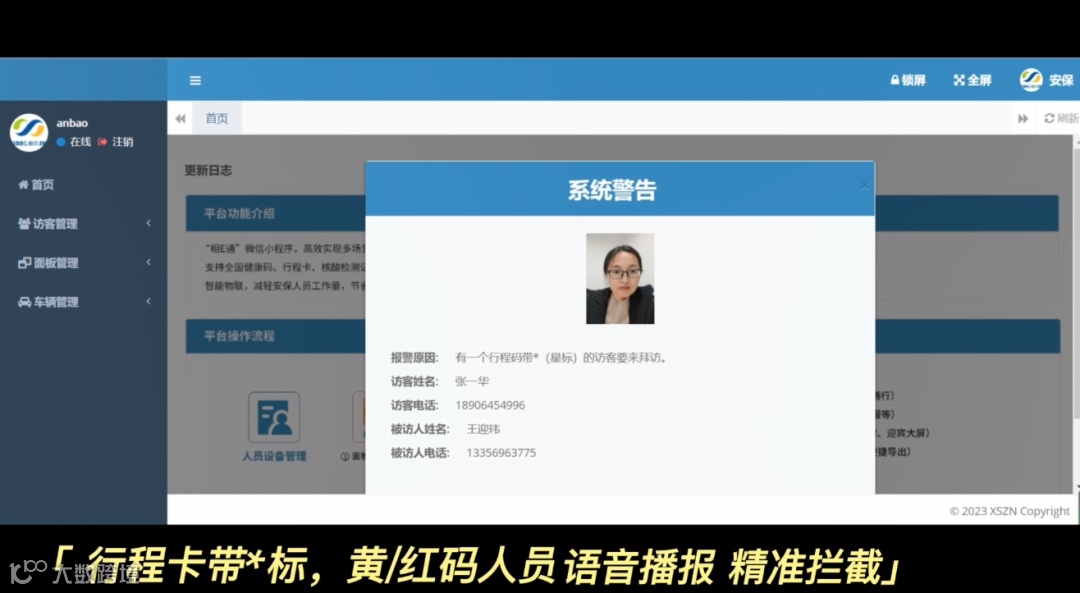A 来访人员健康码、行程卡、核酸检测的手机截图上传核验,系统可将将黄码、红码和星标人员在卡口处拦截,并进行语音播报,大大提高防控的精准度;
