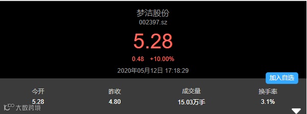 与薇娅合作消息一出,梦洁股份今日开盘一字涨停,股价大涨10.00%,收报5.28元,市值暴涨3.67亿元。