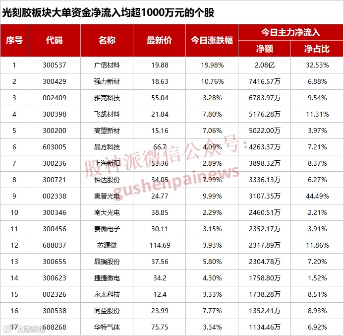 9月17日,题材板块局部活跃。光刻胶概念涨幅居前,广信材料涨停,高盟新材、强力新材、扬帆新材、蓝英装备等多股走强。