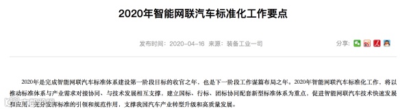 线索摘要:工信部官网4月16日发布2020年智能网联汽车标准化工作要点。