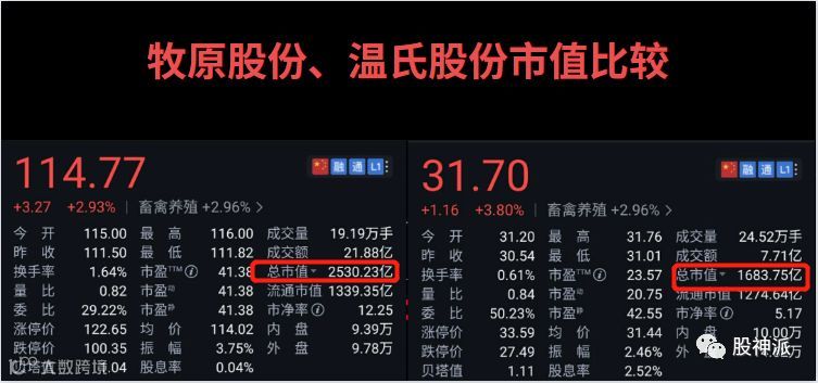 业内一直有“得母猪者得天下”的说法,与温氏“争霸”的牧原股份,由于能繁母猪存栏数增长迅猛,目前市值高达2530亿元,已经将昔日老大、最新市值1683亿元的温氏股份拉下马。