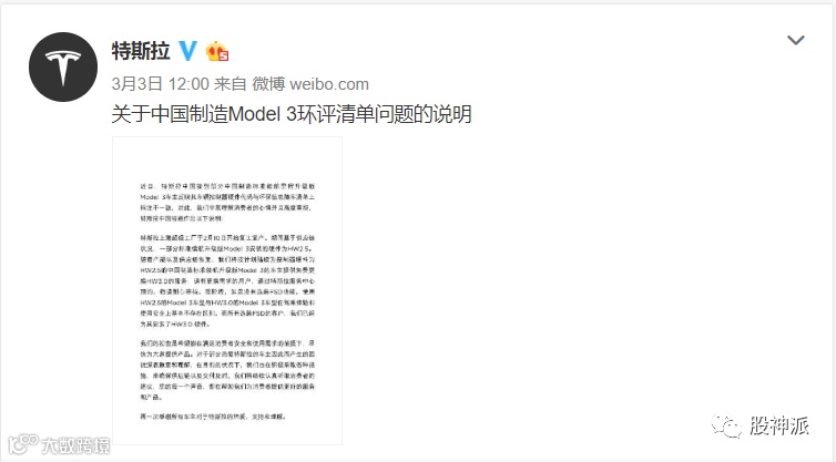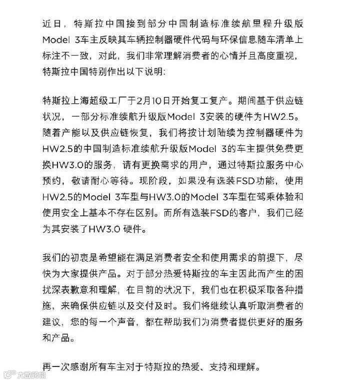 3月3日,特斯拉官方微博发布“关于中国制造Model 3环评清单问题的说明”,解释称特斯拉上海超级工厂于2月10日开始复工复产,期间基于供应链状况,一部分标准续航升级版Model 3安装的硬件为HW2.5。