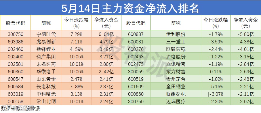 主力资金净流入前5的个股是宁德时代,兆易创新,赣锋锂业,省广集团,未名医药,净流入额分别为6.04亿、4.79亿、3.49亿、3.21亿、2.80亿。