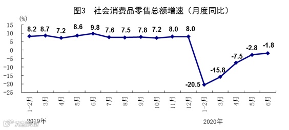 上半年,社会消费品零售总额172256亿元,同比下降11.4%,降幅比一季度收窄7.6个百分点;其中二季度下降3.9%,比一季度收窄15.1个百分点。6月份,社会消费品零售总额33526亿元,同比下降1.8%,降幅比5月份收窄1.0个百分点;环比增长1.34%。