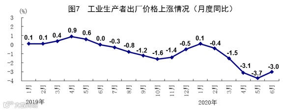 上半年,全国工业生产者出厂价格同比下降1.9%;其中6月份同比下降3.0%,环比上涨0.4%。上半年,全国工业生产者购进价格同比下降2.6%;其中6月份同比下降4.4%,环比增长0.4%。