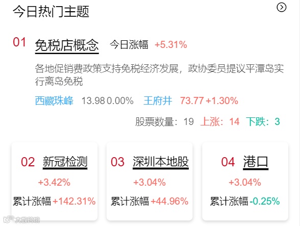 盘中题材反复轮动,免税店概念强者恒强,带动新零售等公司全天领涨,深圳本地股、港口、汽车、核电、影视、病毒防治等先后异动拉升,尾盘水利板块大幅冲高。