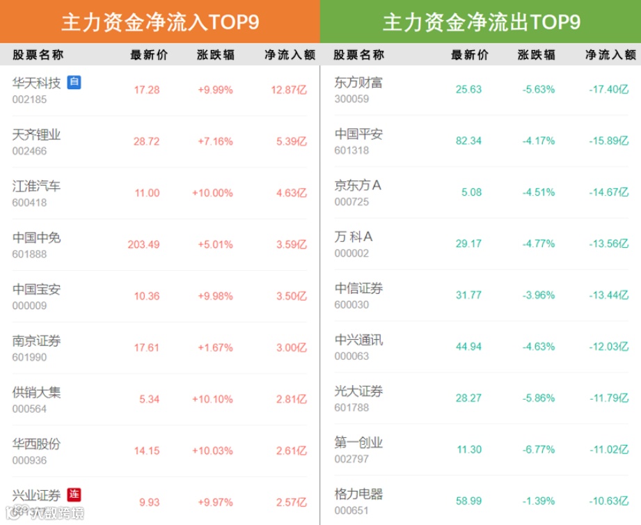 主力资金净流入前5的个股是华天科技、天齐锂业、江淮汽车、中国中免、中国宝安,净流入额分别为12.87亿、5.39亿、4.63亿、3.59亿、3.50亿。主力资金净流出前5的个股是东方财富、中国平安、京东方A、万科A、中信证券,净流出额分别为17.40亿、15.89亿、14.67亿、13.56亿、13.44亿。
