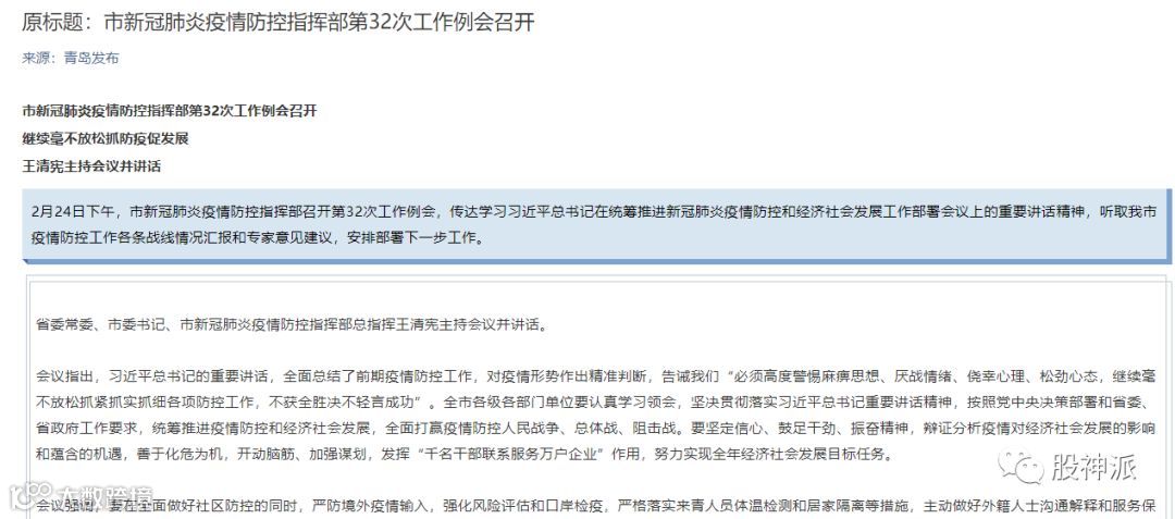 2月24日下午,青岛市新冠肺炎疫情防控指挥部第32次例会召开,山东省委常委、青岛市委书记、市新冠肺炎疫情防控指挥部总指挥王清宪再次强调: