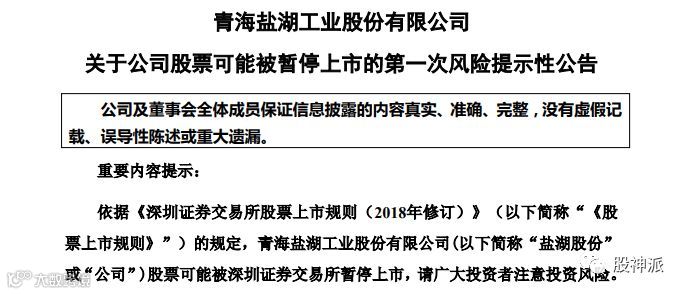 爆出巨额亏损,净资产也将为负值,在发布上述公告的同时,*ST盐湖也开始提示股票可能被暂停上市的风险。