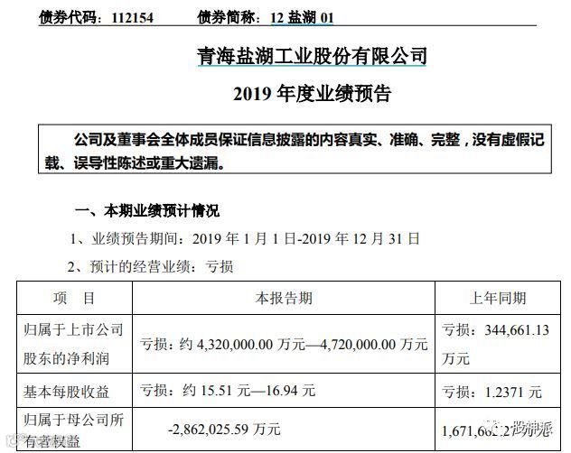 11日晚间,*ST盐湖发布年报预告称,公司预计去年净亏损约432亿元-472亿元,相比于2018年净亏损34.5亿元大幅增加。这么一笔巨大的亏损是什么概念?目前*ST盐湖总市值约239亿,相当于一下亏掉了2个总市值。