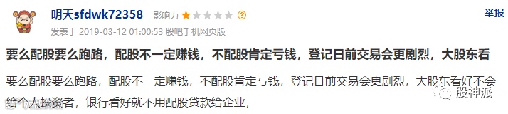 对此,有网友表示:“要么配股要么跑路,配股不一定赚钱,不配股肯定亏钱,登记日前交易会更剧烈,大股东看好不会给个人投资者,银行看好就不用配股贷款给企业。”由此可以看出,配股是不受股东欢迎的。