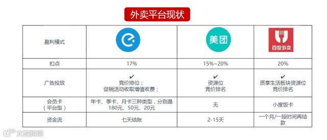 市场份额之外,与饿了么相比,美团外卖的配送能力更优,相应的,饿了么的佣金也更低。