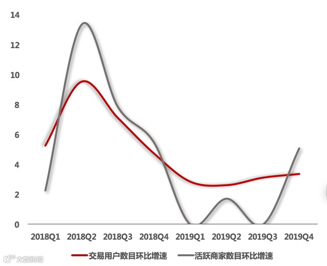 美团2018年—2019年各季度交易用户数和活跃商家数环比增速(%)