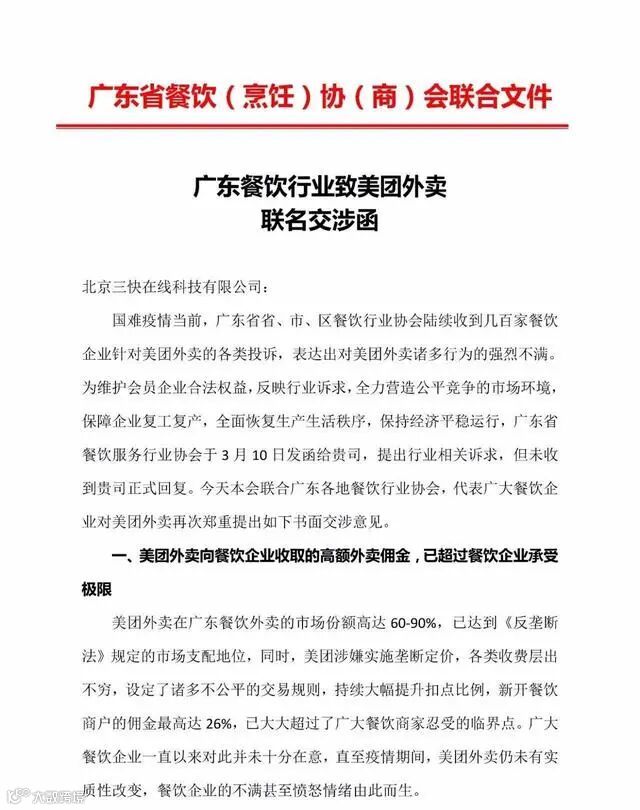 4月10日,广东省餐饮协会携广东地区30余家市级餐饮协会发布致美团外卖的联名函,直指美团外卖在疫情期间向餐饮企业收取高额外卖佣金,已超过餐饮企业承受极限、坚持独家条款涉非法垄断等问题。