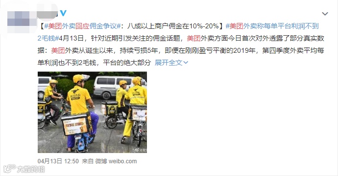 美团在第一时间作出了回应,称美团外卖平均每单利润不到2毛钱,平台的绝大部分收入需要投入在帮助商户提供专业配送、获取订单和数字化建设中。