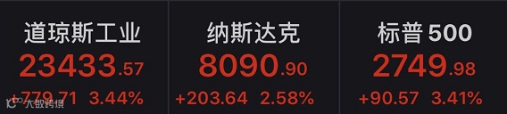 截至美股收盘,道指涨3.44%报23433.57点,标普500涨3.41%报2749.98点,纳指涨2.58%报8090.9点。