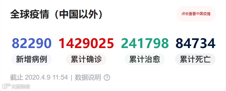 最新疫情数据显示,截至北京时间4月9日11时54分,全球累计确诊病例1512274例(较前一天新增9万例,相当于每1秒就有1位被确诊),累计死亡88078例(较前一天新增6799人)。