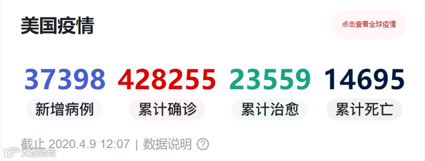 目前,美国是全球累计确诊病例数最多的国家,累计确诊病例419975例,累计死亡14390例。