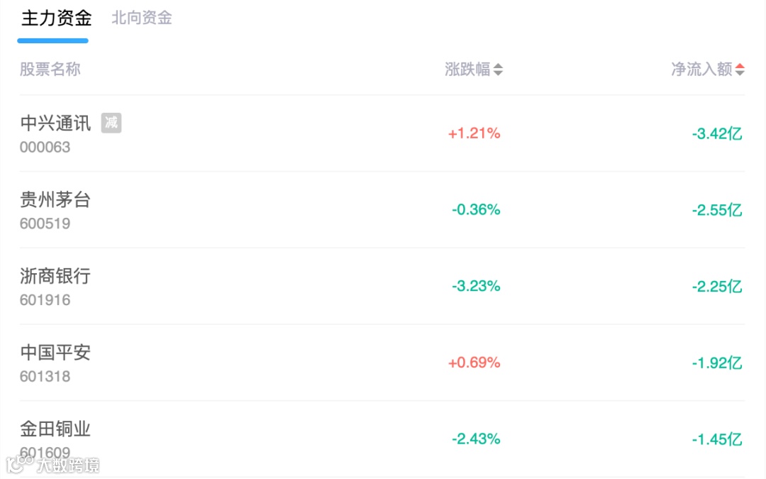 主力资金净流出前5的个股是中兴通讯、贵州茅台、浙商银行、中国平安、金田铜业,净流出额分别为3.42亿、2.55亿、2.25亿、1.92亿、1.45亿。