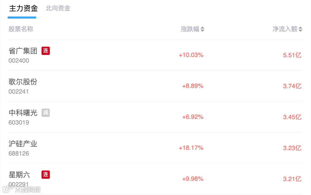 主力资金净流入前5的个股是省广集团,歌尔股份,中科曙光,沪硅产业,星期六,净流入额分别为5.51亿、3.74亿、3.45亿、3.23亿、3.21亿。