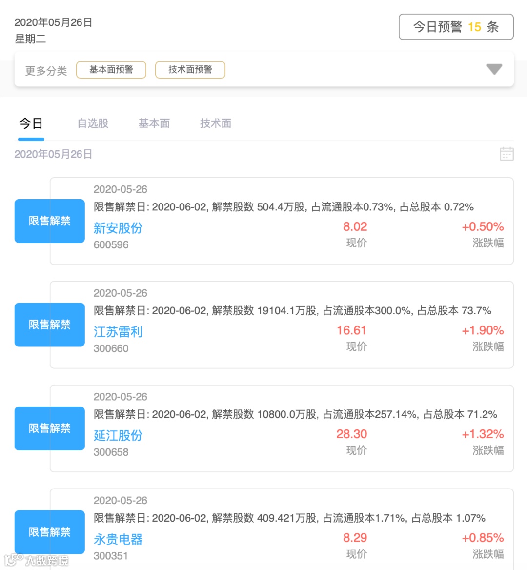 今天日共有15只股票有限售解禁预警,大家注意规避风险,以下是部分限售解禁的股票截图(图片来源:股神派)。