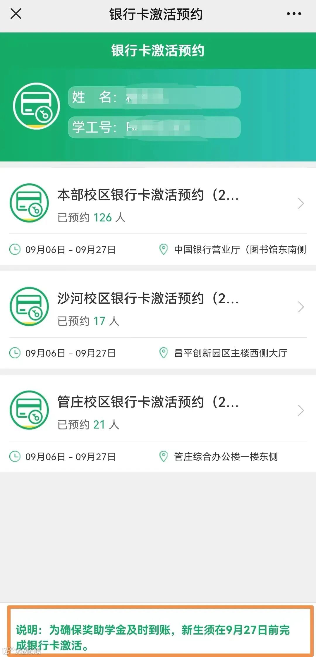 2、未在规定时间激活的银行卡,银行将做关户处理。为了不影响奖助学金的正常发放,新生须在9月27日之前完成银行卡激活。