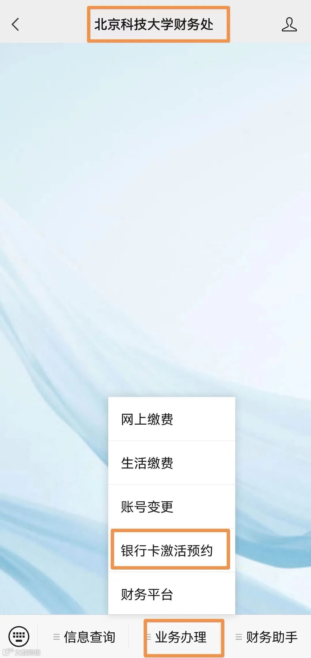 1.关注“北京科技大学财务处”微信公众号