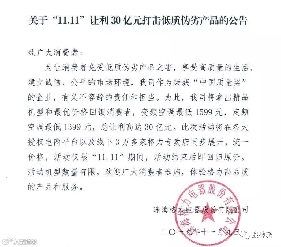 11月10日,格力电器公告称,“11.11”期间让利30亿元,打击低质伪劣产品,变频空调、定频空调最低价分别至1599、1399元。也就是说,格力给出的优惠超过了40%!
