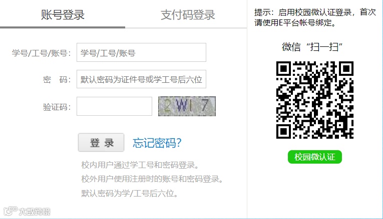 ※ 登录电子支付平台时可以选择账号密码登录或校园微认证登录。登录账户为学号,初始密码为证件号后6位,如忘记密码可通过预留手机号或邮箱找回。