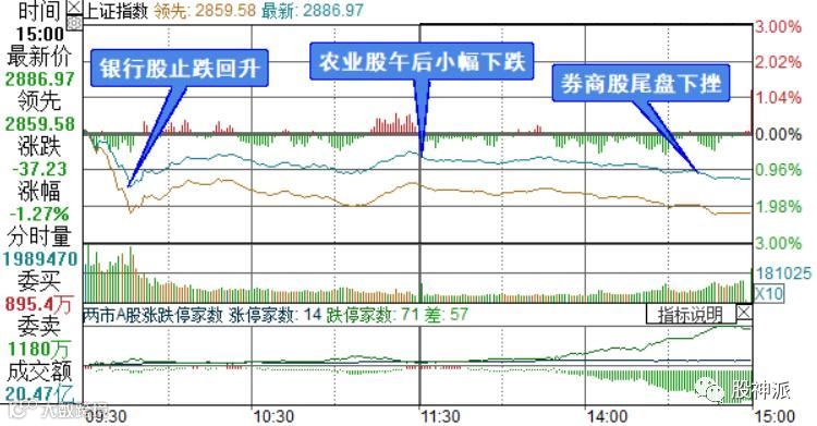 截至沪深股市全天收盘,上证综指收报2886.97点,下跌37.23点,跌幅1.27%,成交额2042.89亿元;深证成指收报9122.64点,下跌105.91点,跌幅1.15%,成交额2098.36亿元;创业板指收报1515.97点,下跌26.01点,跌幅1.69%,成交额687.68亿元。