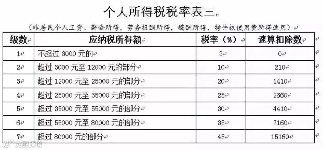 以全年一次性奖金收入除以12个月得到的数额,按月换算后的综合所得税率表(如下图所示),