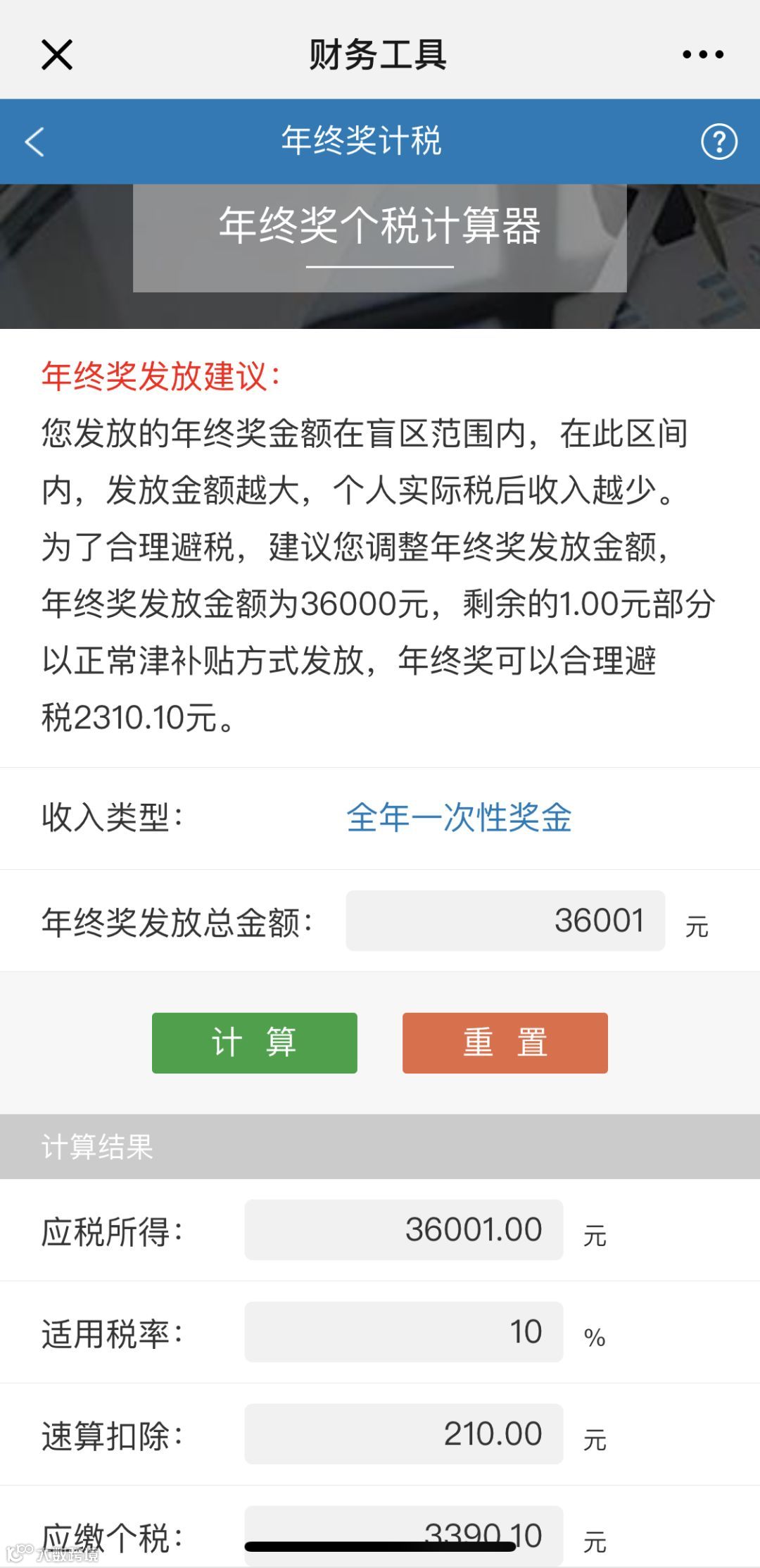 为了更好的服务全校师生, 最大限度的帮助各位老师。财务公众号开发了年终一次性奖励计算器功能。点击财务工具-年终奖计税,即可一键计算,我们还贴心的设计了年终奖发放建议功能,为老师们提供参考。(如下图所示)
